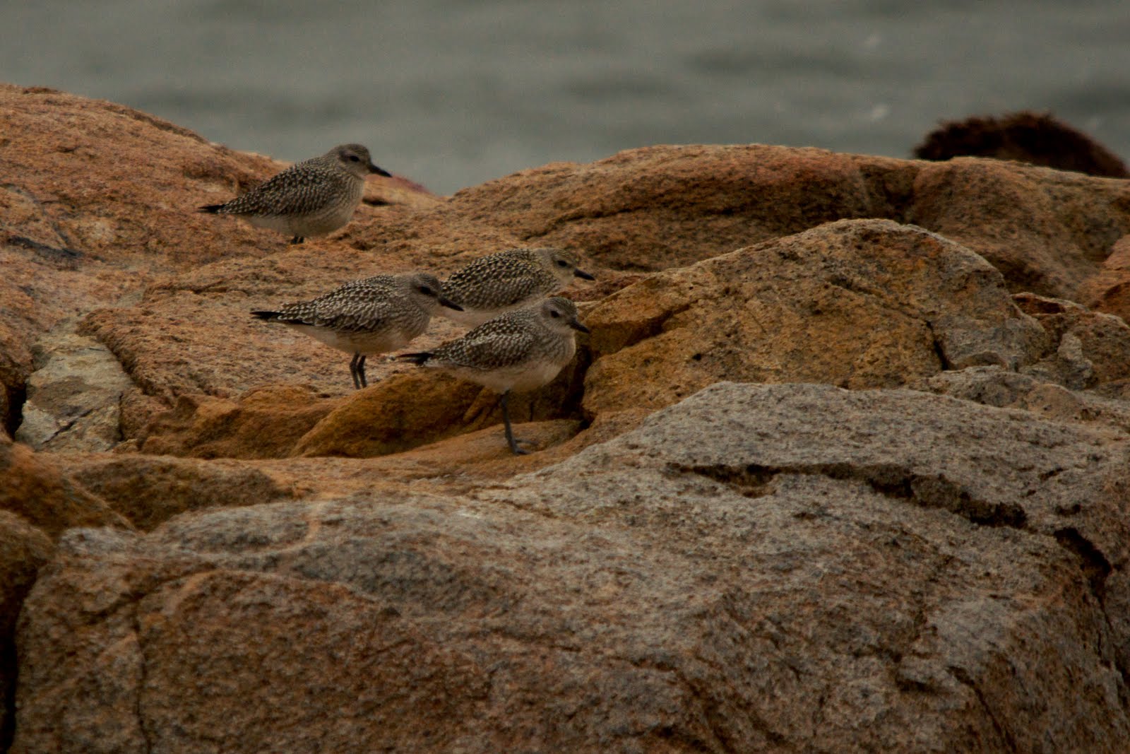 Well, with gourmet coffee, a good book and the love of my life beside me, I settled into a pleasant morning. Then we noticed movement in the granite boulders 100 feet in front of us. A flock of migrating Black-bellied Plovers had taken refuge in the nooks and crannies of the rocks. Braving the elements (which is a bit of an overstatement) I captured an image of these birds whose mental state best reflected my own, except that I had coffee.